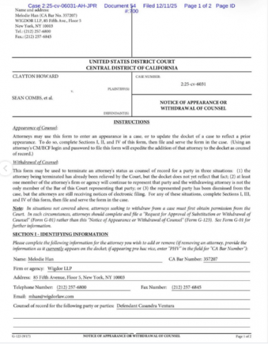 Clayton Howard es un exbailarin y extrabajador sexual que fue contratado por Cassie y por Diddy en numerosas ocasiones. Howard asegura que la cantante también debe estar imputada por los mismos cargos que Combs, debido a que, según él, lo hacía voluntariamente.